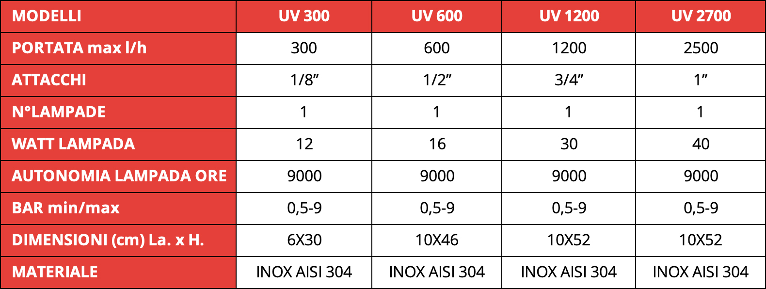 Gli sterilizzatori UV sono assemblati e prodotti in Italia e sono conformi al Decreto del Ministero della Sanità N.25/2012, per il trattamento dell’acqua potabile, al D.M. N.174/2004 per i certificati CE. Sono disponibili sterilizzatori per alte portate d’acqua.